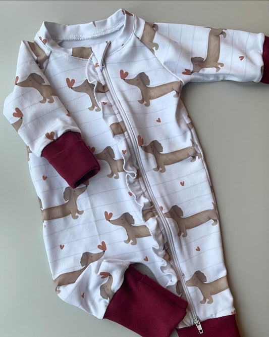 Our limited edition Valentines collection for 2026 features 5 adorable designs. Sausage dog baby clothes for valentines day is the perfect fit.